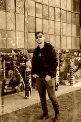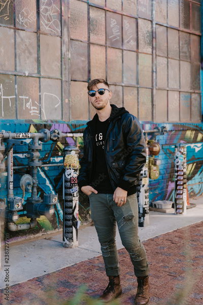 Portrait of Modern Young Person Hipster Guy Standing Alone in Urban Street Covered Colorful Graffiti Alleyway Outside in the City