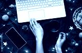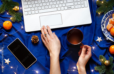 Blue Christmas New Year flat lay on the bed blanket with the laptop keyboard and a phone. Womans hands are holding a cup of tea and working with a computer. Winter holiday festive card. Top view