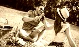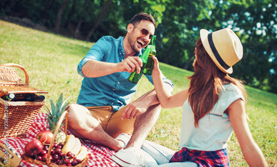 Loving couple enjoying picnic in the park. Love and tenderness, dating, romance, lifestyle concept