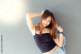 Portrait cheerful woman. Attractive beautiful woman gets happiness with smile face. Charming beautiful young lady wears jeans, camisole and holding denim denim jacket. Cool girl has nice skin and body