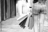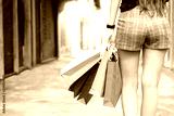Pretty woman is walking around the city for shopping some goods at shops. Attractive beautiful woman hold shopping bags. Charming girl buys a lot of things. Traveler or tourist woman love shopping