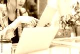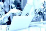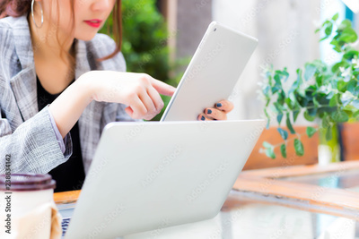 Attractive beautiful businesswoman is working on tablet and laptop at coffee shop. Charming beautiful young woman is finding some job on laptop. She want to getting better job and more money or salary