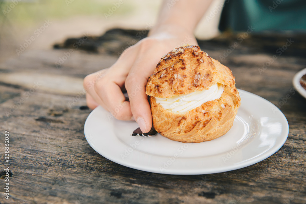 Close up of female hand touching Choux cream (or cream puff) serving on white dish on the wooden table. French dessert.