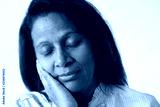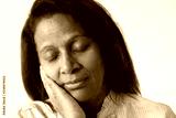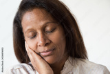 Closeup of tired sleepy dark skinned woman. Mid adult lady with closed eyes leaning cheek on hand. Sleeping concept