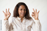 Content Latin lady approving product or service. Positive middle aged woman showing ok with both hands. Customer feedback concept