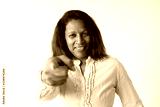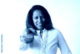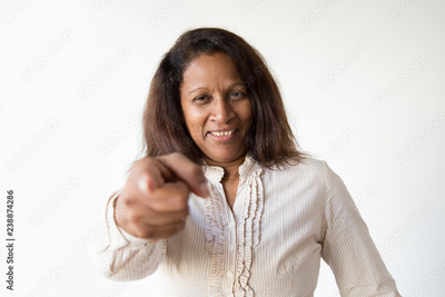 Joyful mix raced woman choosing you. Happy dark skinned lady pointing finger at camera. Selection concept