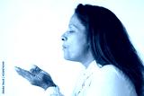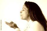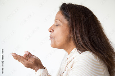 Peaceful dark skinned woman sending air kisses. Side view of middle aged lady expressing love and tenderness. Love concept