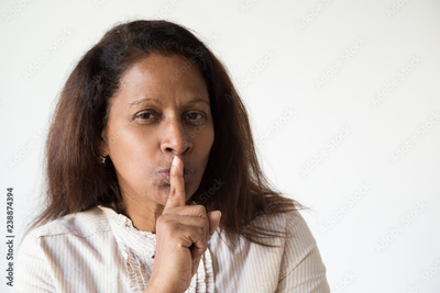 Playful dark skinned lady keeping secret. Positive mid adult woman showing shh gesture. Silence concept