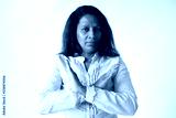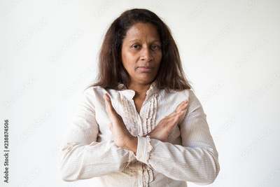 Serious Latin lady showing prohibition gesture. Mid adult woman keeping arms crossed in rejection sign. Rejection concept