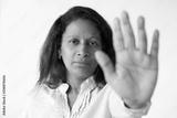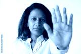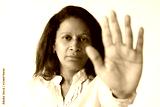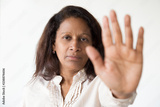 Strict serious mix raced woman gesturing stop. Mid adult lady raising hand and showing palm in prohibiting sign. Prohibition concept