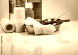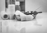 Wound care dressing set and stainless steel basin, forceps, alcohol bottle, normal saline, cohesive elastic bandage, conforming bandage, container for surgical. Medical supply. Medical equipment tools