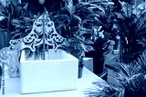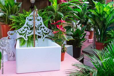 Bathroom interior sink with modern green design. Interior of bathroom with washbasin and faucet surrounded by fresh green plants in the pots. Selective focus, copy space.
