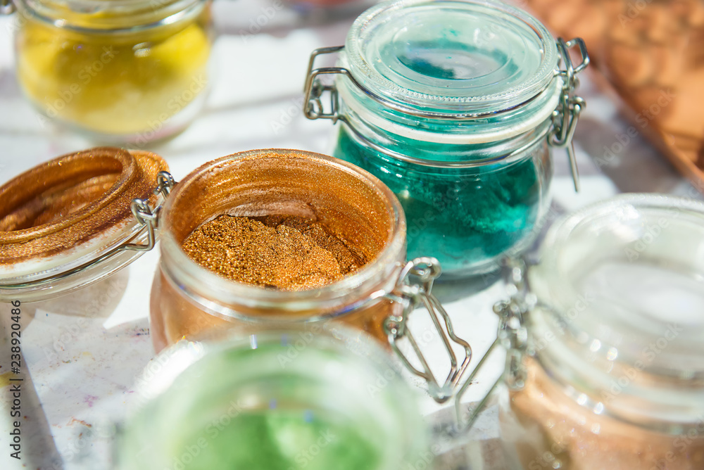 Tinsel. Shimmer. For makeup, manicure and decorating clothes. Beautiful bright background. Cosmetic, beauty products. Sparkles, confetti, glitter for decor. Multicolored eyeshadow Selective focus.