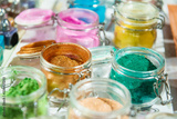 Tinsel. Shimmer. For makeup, manicure and decorating clothes. Beautiful bright background. Cosmetic, beauty products. Sparkles, confetti, glitter for decor. Multicolored eyeshadow Selective focus.
