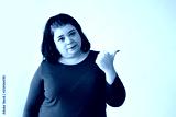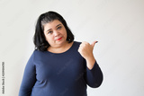 Brunette overweight woman pointing with thumb on empty space. Beautiful Latin woman advertising something on copy space. Isolated on white. Advertisement concept
