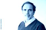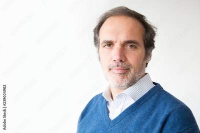 Handsome serious mature man looking at camera. Middle aged man with grey hair and beard posing in blue sweater. Isolated on white. Confidence concept