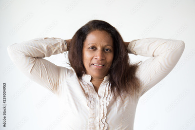 Indian brunette woman relaxing with hands behind head. Joyful beautiful woman resting and looking at camera. Isolated on white. Joyfulness concept