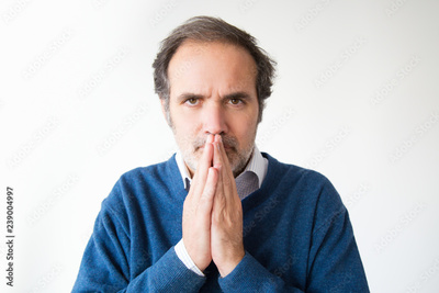 Middle aged man keeping palm together in please gesture. Caucasian bearded man wishing success. Isolated on white. Praying gesture concept
