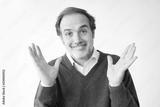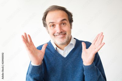 Positive mature man with shrug gesture looking at camera. Cheerful Caucasian man with do not know gesture. Isolated on white. Question concept