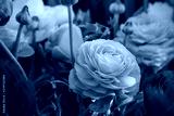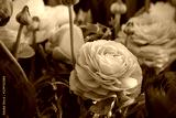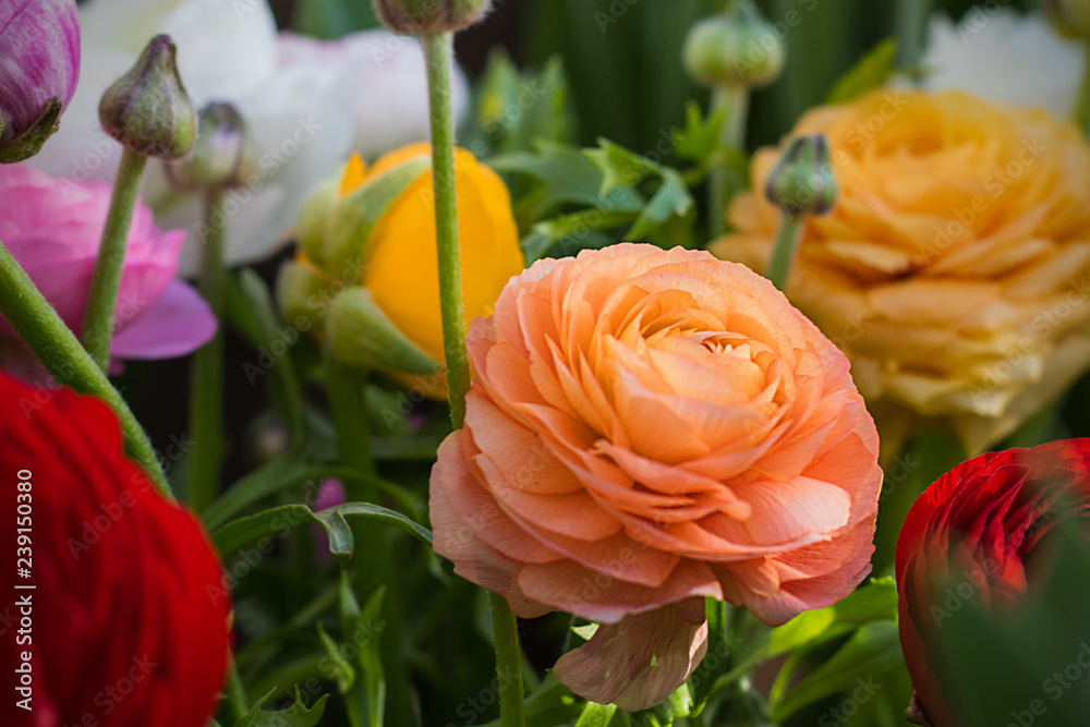 ranunculus, many bright flowers on the background of garden, one orange is in focus