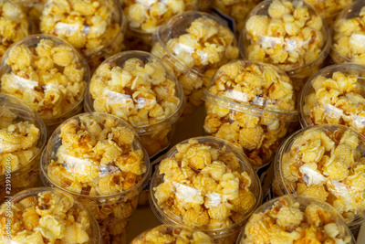 Popcorn in a plastic cup is beautifully placed. Unhealthy food or snack concept. Tasty salty popcorn. Carbohydrates food. Junk food. Popcorn on plastic glass for sale or donate for charity event.