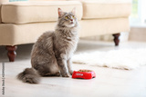 Adorable Maine Coon cat near bowl with food at home. Space for text