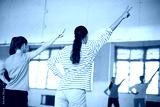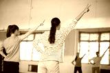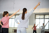 Two girls showing peace gesture while raising their arms during dance performance in studio