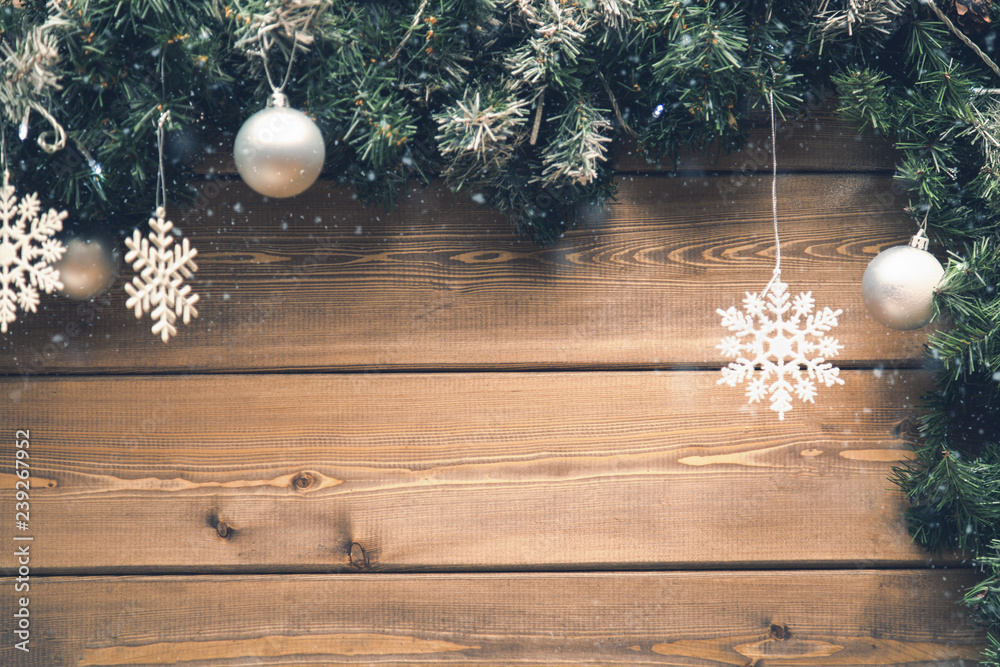 Christmas fir tree branches with decorations on a wooden board with snow. Top view with free space for your text