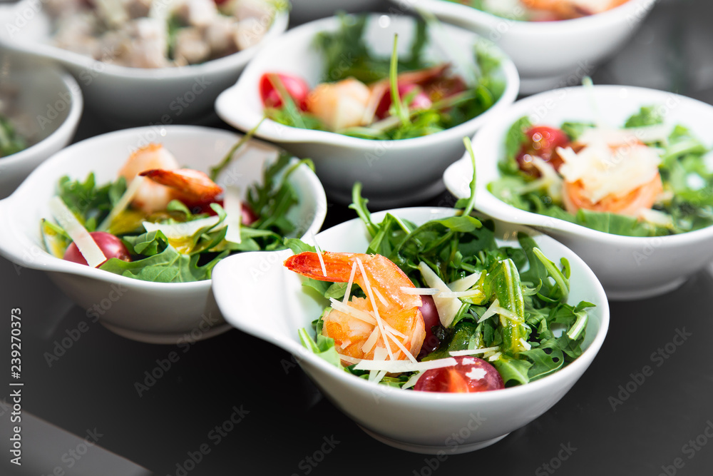 Tasty salad plates with shrimps. Close up image with selective focus.