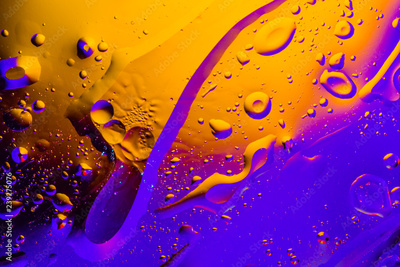 Macro shot of oil bubbles with water on colorful background. Space and universe planets styled abstract image