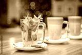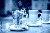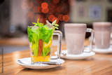 Cup of tea with mint, cinnamon and lemon of white plate. Nice red bokeh above the cup.