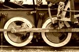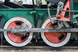 Old train and locomotive wheels. Railroad tracks stretches and green grass and trees. Railway road environment background.