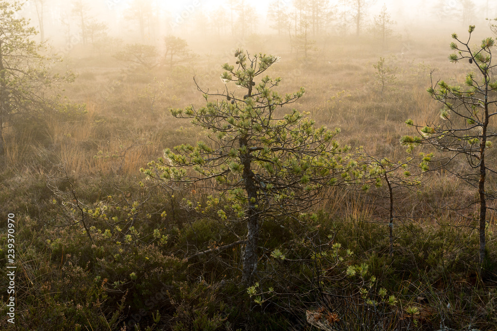 Sunrise in the bog landscape. Misty marsh, lakes nature environment background