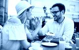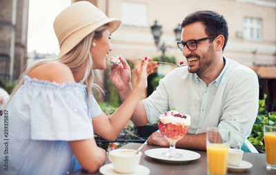 Dating in the cafe. Loving couple drinking coffee and eating fruit desserts. Dating, love, relationships