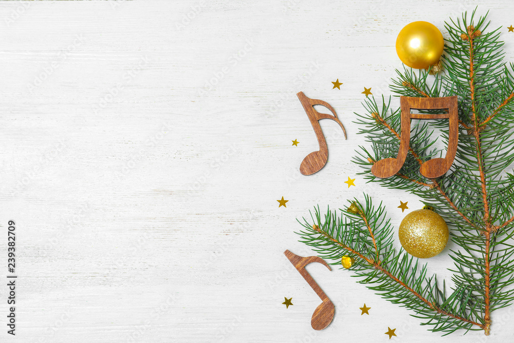 Flat lay composition with Christmas decor, music notes and space for text on white wooden background
