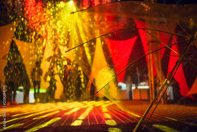 Close up transparent umbrella with drops on the background of artificial rain coming from ceiling and illuminated by colored lights. Unusual event entertainment solution. Selective focus, copy space