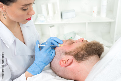 The doctor cosmetologist makes the Rejuvenating facial injections procedure for tightening and smoothing wrinkles on the face skin of a men in a beauty salon.Cosmetology skin care.