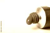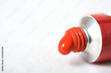 Red acrylic paint squeezed out of the tube. Selective focus and shallow depth of field.