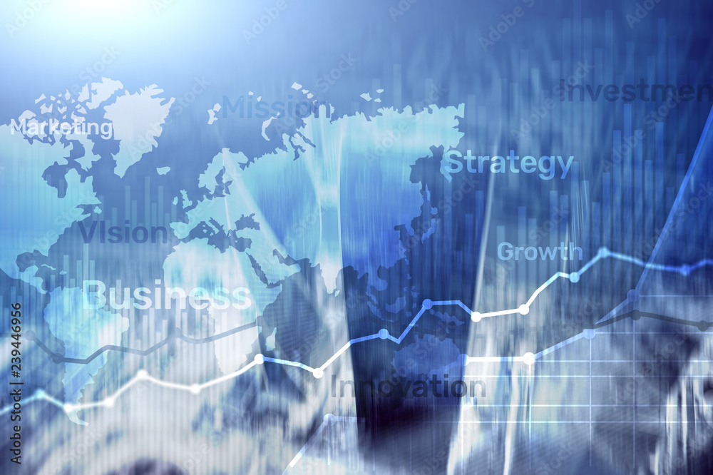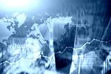 Business abstract background double exposure graph, chart and diagram. World wide map and. Global business and financial trading concept