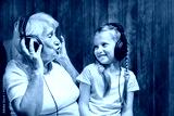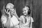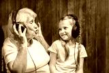 old woman and little girl in headphones listening to music grandmother and granddaughter