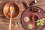Preparing homemade mask with clay. A lot of ingredients for home made cosmetics in background
