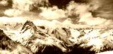 Black and white panorama of snowy winter mountain in sunlight clouds