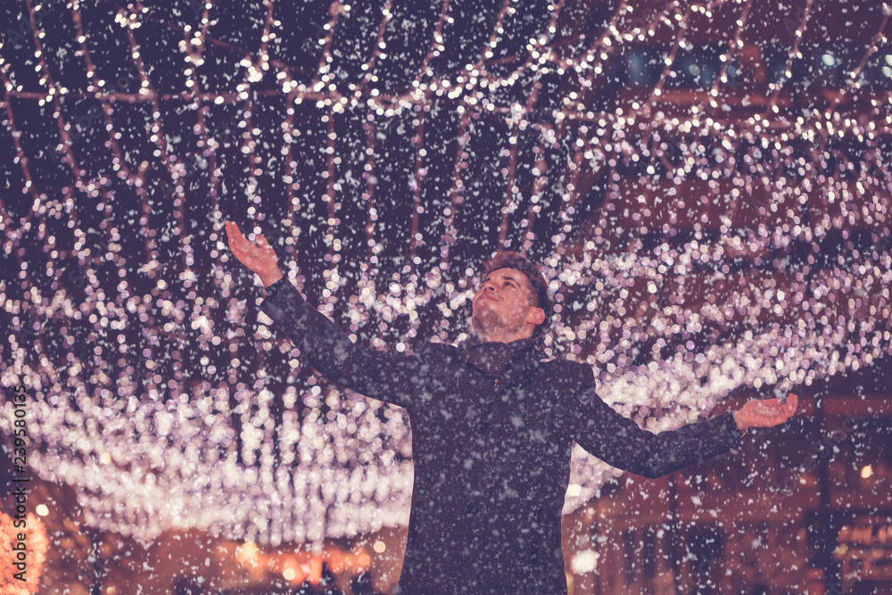 Man with outstretched arms looking up at decorated street at night