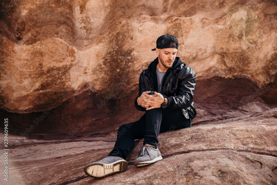 Portrait of Young Good Looking Casual Traveling Handsome Man Smiling Near Ancient Desert Red Rocks in Jacket Outside