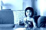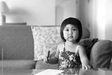 Lovely little asian girl is holding pen and writing something on paper at living room during mom calling her that make toddler girl stop writing and look at her mother. Cute little girl love writing