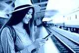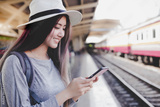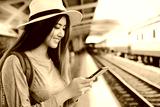 Charming beautiful traveler woman is searching interesting place or the way for traveling on smartphone by using some application on internet online service. Attractive beautiful girl get happy, smile