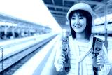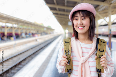 Attractive beautiful woman stand at train station and going to some place by train. Lovely woman love traveling everywhere alone by herself and gets new experience everywhere that she goes with happy