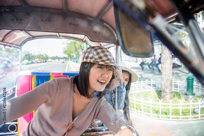 Lovely woman is driving auto rickshaw on the road so fast and feels happy, fun that makes her pretty friend gets scared and worry falling down from the vehicle. They’re best friend or close friend