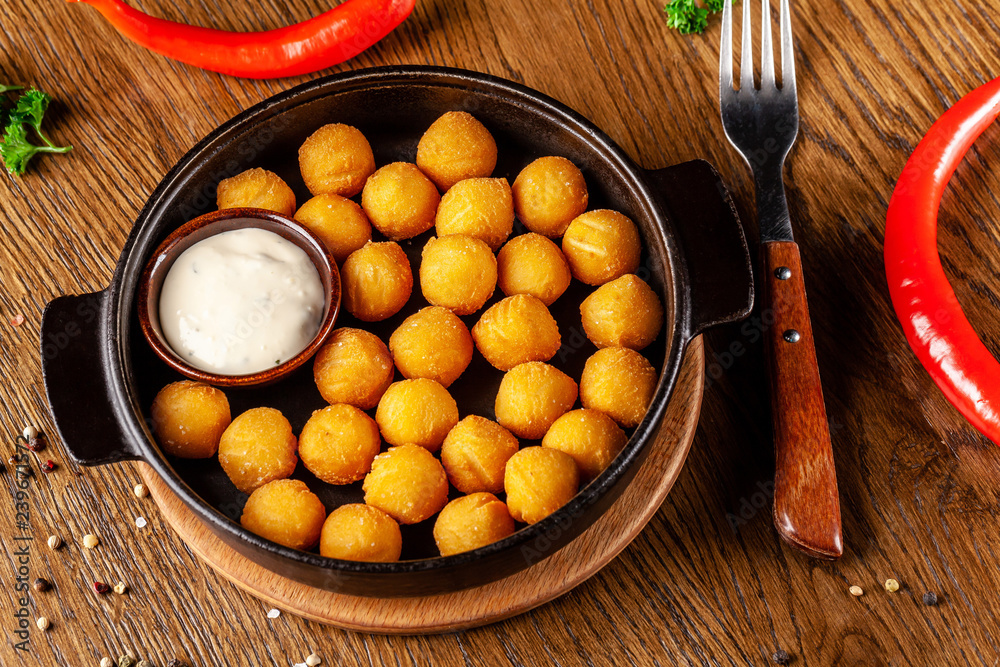 Czech cuisine concept. Potato croquettes. Balls of mashed potatoes, breaded, deep-fried in a cast iron pan. Served with raw sauce. Snack to beer.