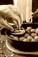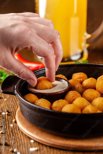 Czech cuisine concept. Potato croquettes. Balls of mashed potatoes, breaded, deep-fried in a cast iron pan. Served with raw sauce. Snack to beer.